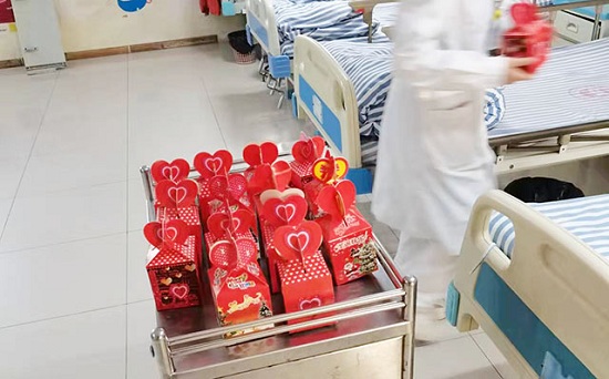 “希望这个平安果能给你们带来健康好运,祝你早日康复、平安快乐,更希望你们今后的生活,就像这个平安果一样红红火火、幸福美满。”医护人员一边往患者手中递平安果一边送上祝福。